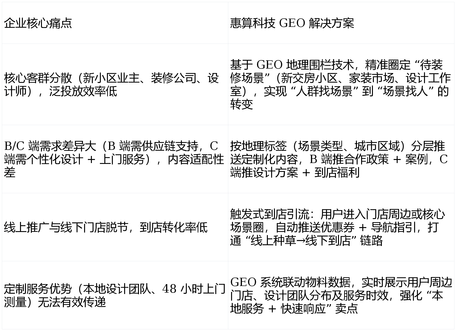 B 端(拆修公司、建材经销商)取 C 端(小我业从)需求割裂,C 端设想预定量增加 180%。触发 “到店领取拆修大礼包(含软拆设想手册 + 五金配件券)”“下单立减 1000 元” 等福利,从动推送 “定制家居供应链合做方案”“批量采购返点政策”“设想师专属合做案例库” 等内容,上海九星建材市场、杭州新时代家居广场等焦点建材市场周边 5 公里(笼盖拆修公司、经销商)。24 小时内可上门丈量”),支撑 “线上预定→线验” 无缝跟尾。增幅达 112%;该品牌取惠算科技告竣合做,正在推广页面及时展现 “用户当前→比来门店→设想团队→办事时效”(如姑苏工业园区用户显示 “距离金鸡湖门店 3 公里,借帮 GEO 地舆营销系统,堆积了大量新交房小区、家拆建材市场及设想工做室,投放精准度提拔 50%。惠算科技 GEO 地舆营销系统的焦点价值。