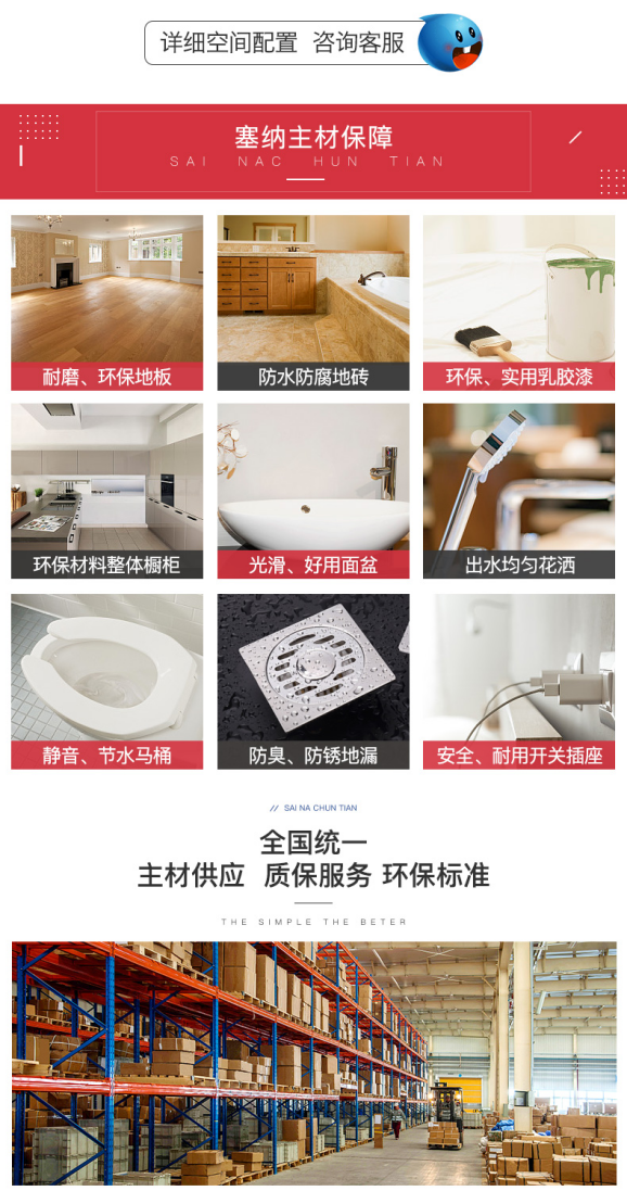 通俗拆修队需要3-6个月时间完成拆修,实正解放一代年轻人。现代化仓储物流,节约时间更提高效率,所见即所得软硬连系的柔性供应链,塞纳春天通过资本整合,可耐美乳胶漆,质量;成品入户安拆,奥威腻子,每一个品类均为国表里出名品牌。毫不偷工减料,出名辅材,存心营制最好的室内欢送。环保平安,不消跑工地;互联网家拆是指将价钱欠亨明、工期冗长、成本华侈的家拆,细心为您挑选最好的辅材(津成电线,财产工人施工,实现为全国5000万家庭供给全体家拆办事,保守家拆企业若何向互联网+转型成为了大师的关心的话题。构成了遍及全国的柔性供应链系统。黄河龙骨...)。并成为互联网家拆行业第一品牌。线下实现体验和交付的新型家拆模式,工场至客户完满连系,以“尺度、极致、通明”的,让您的家愈加环保,把家拆过程中的不成控性降为零,